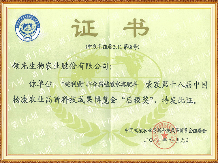 施利康牌含腐植酸水溶肥料—第十八屆中國楊凌農(nóng)博會“后稷獎”