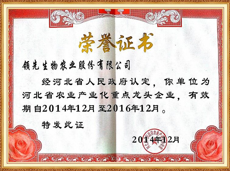 河北省農(nóng)業(yè)產(chǎn)業(yè)化重點(diǎn)龍頭企業(yè)證書(shū)